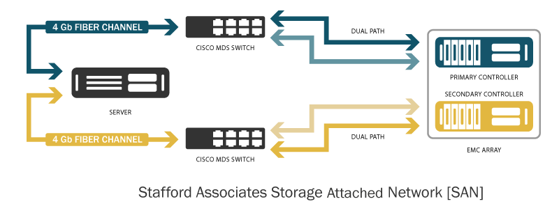 Adding bigger or faster drives to your server will only go so far. Meeting the scalability, reliability and performance needs of your most important applications is crucial and a SAN from Stafford Associates can help. Our customizable solution can include Host Bus Adaptors (HBAs), dedicated network switches and an enterprise-class storage array. Options available to meet any performance metric or price point.